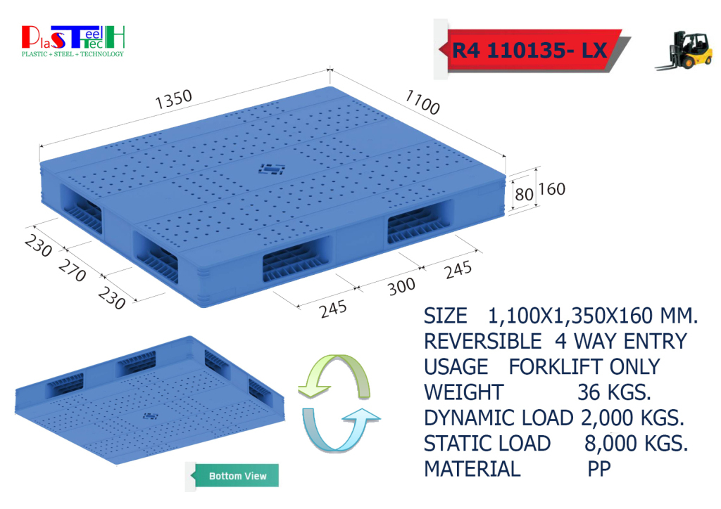 1,100×1,350×160 mm Reversible Plastic Pallet (Blue Color)