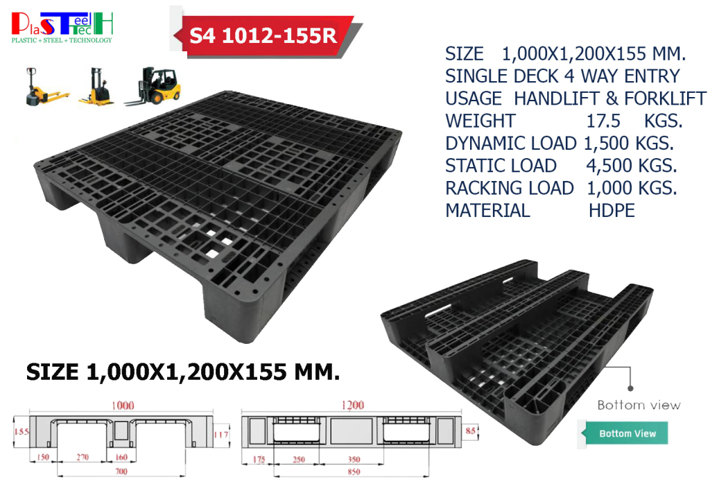 1,000×1,200×155 mm พาเลทพลาสติก หน้าตะแกรง ขา E